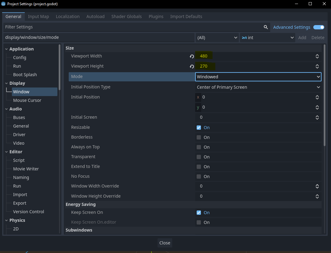 Set Viewport Width to 480 and Viewport Height to 270. This is the resolution the game renders at.